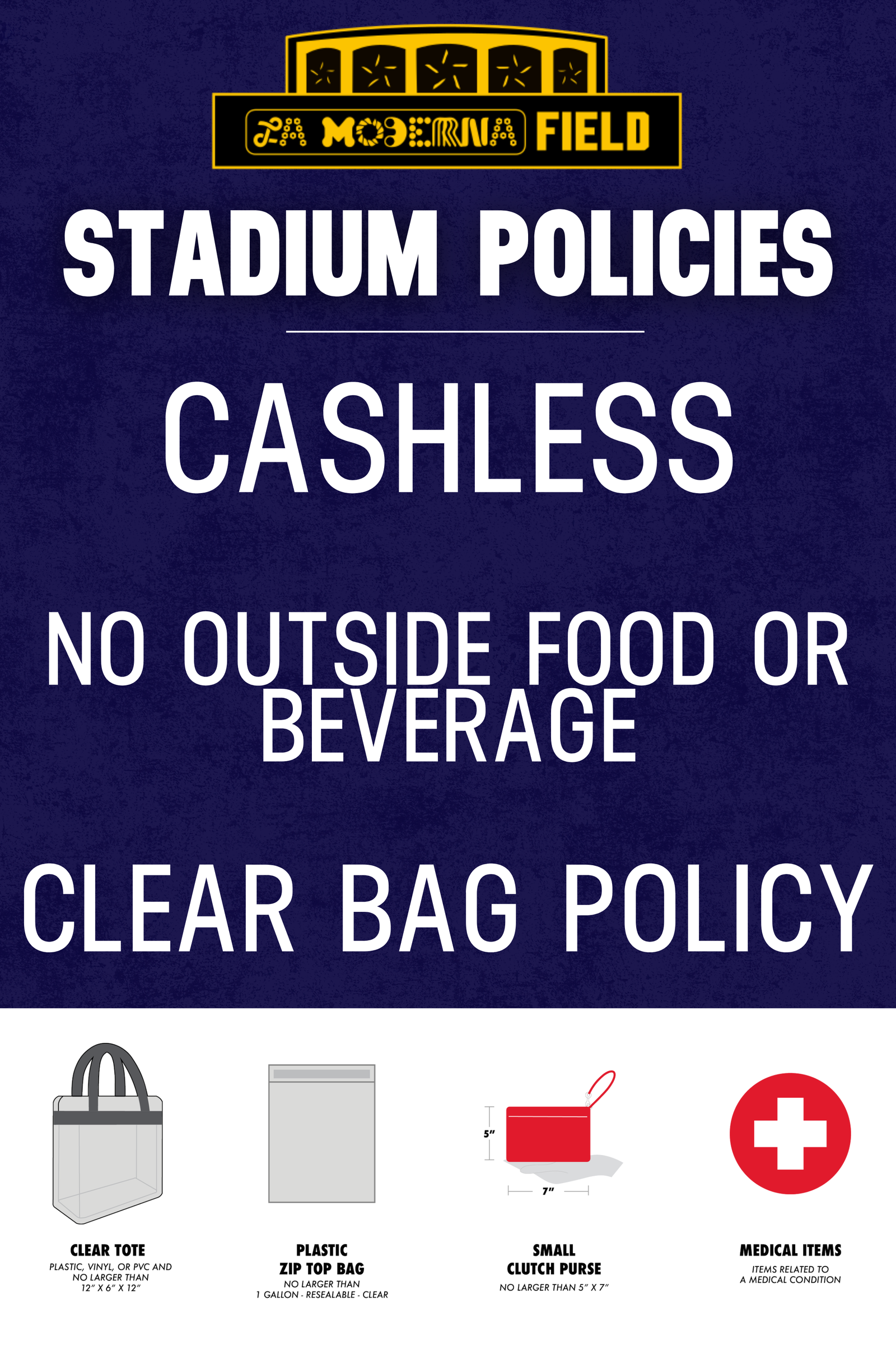 Food & Beverage. Fans are not permitted to enter La Moderna Field with outside food or beverage of any kind. Containers such as picnic baskets, coolers or ice chests are not permitted.
